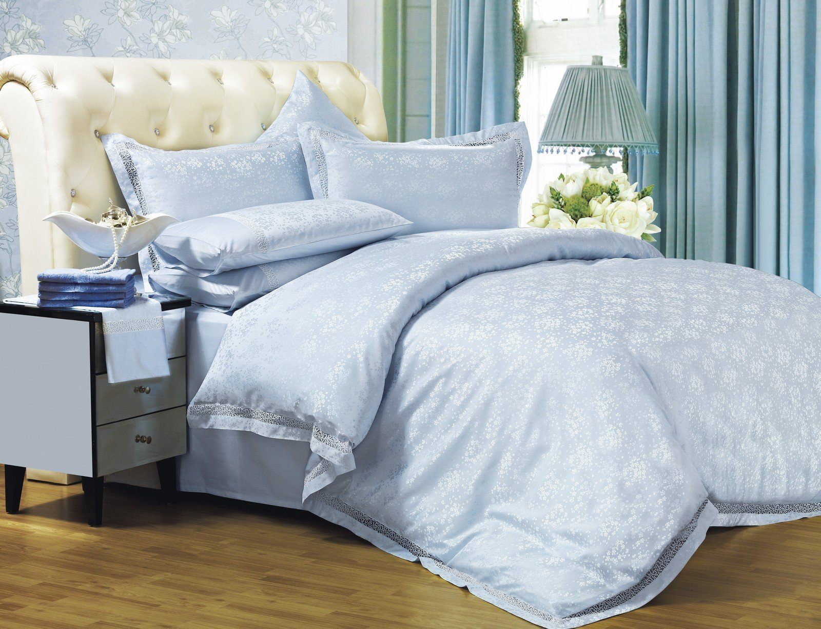 Идеальным местом для романтического отдыха станет кровать с этим комплектом: мелкие мерцающие соцветия на небесно-голубом фоне в сочетании с вставками из полупрозрачного кружева придают воздушность и лёгкость дизайну, становясь сообщниками ваших самых сердечных моментов.