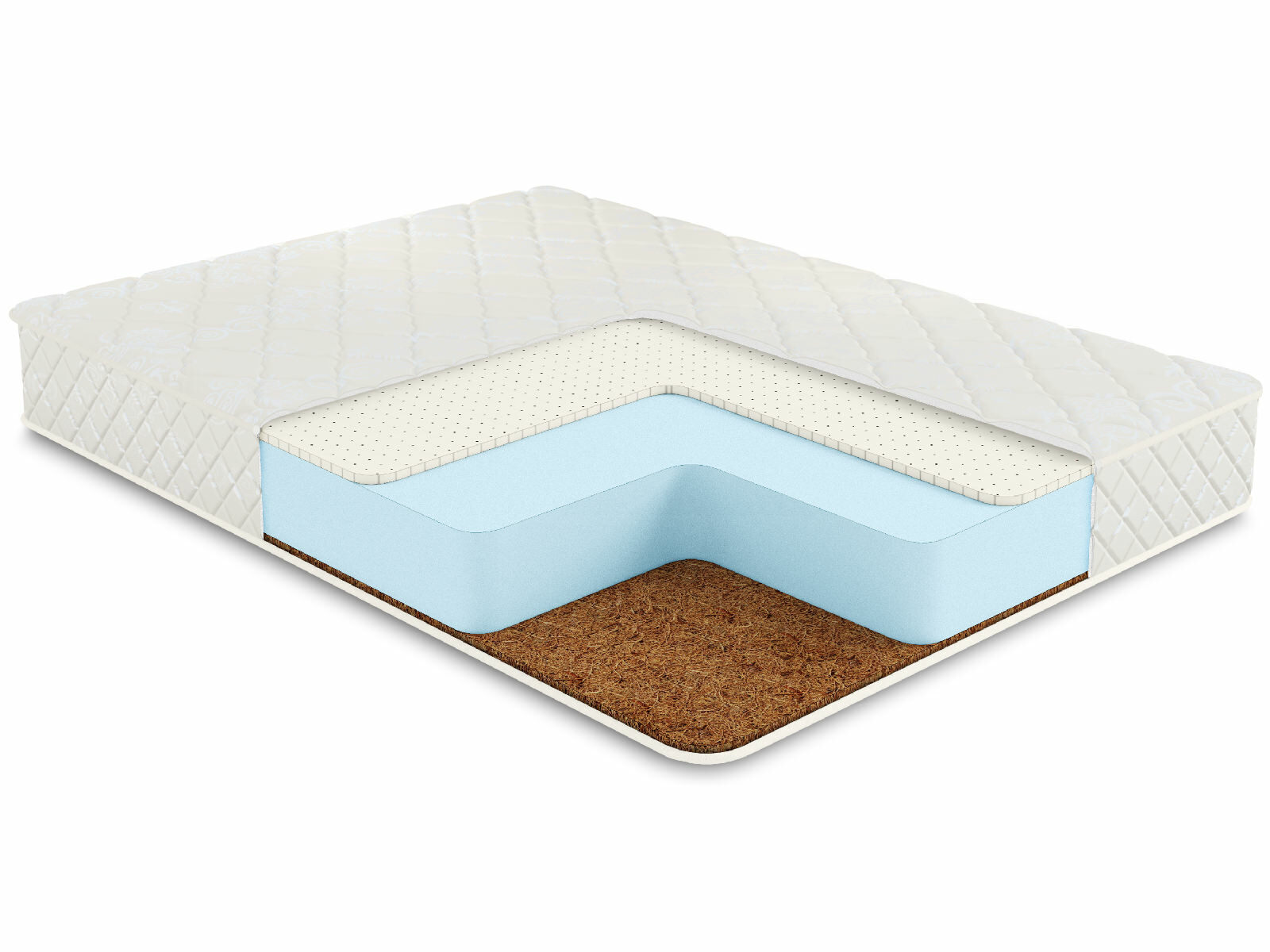Внутри матрас представлен сразу тремя слоями. Главным наполнителем здесь выступает блок искусственного латекса, его здесь установлено сразу 14 см. В дополнение к нему идут 1 см плиты кокосовой койры и натурального латекса, которые проложены сразу у поверхностей. Таким образом матрас приобретает различную жёсткость – среднюю и высокую.