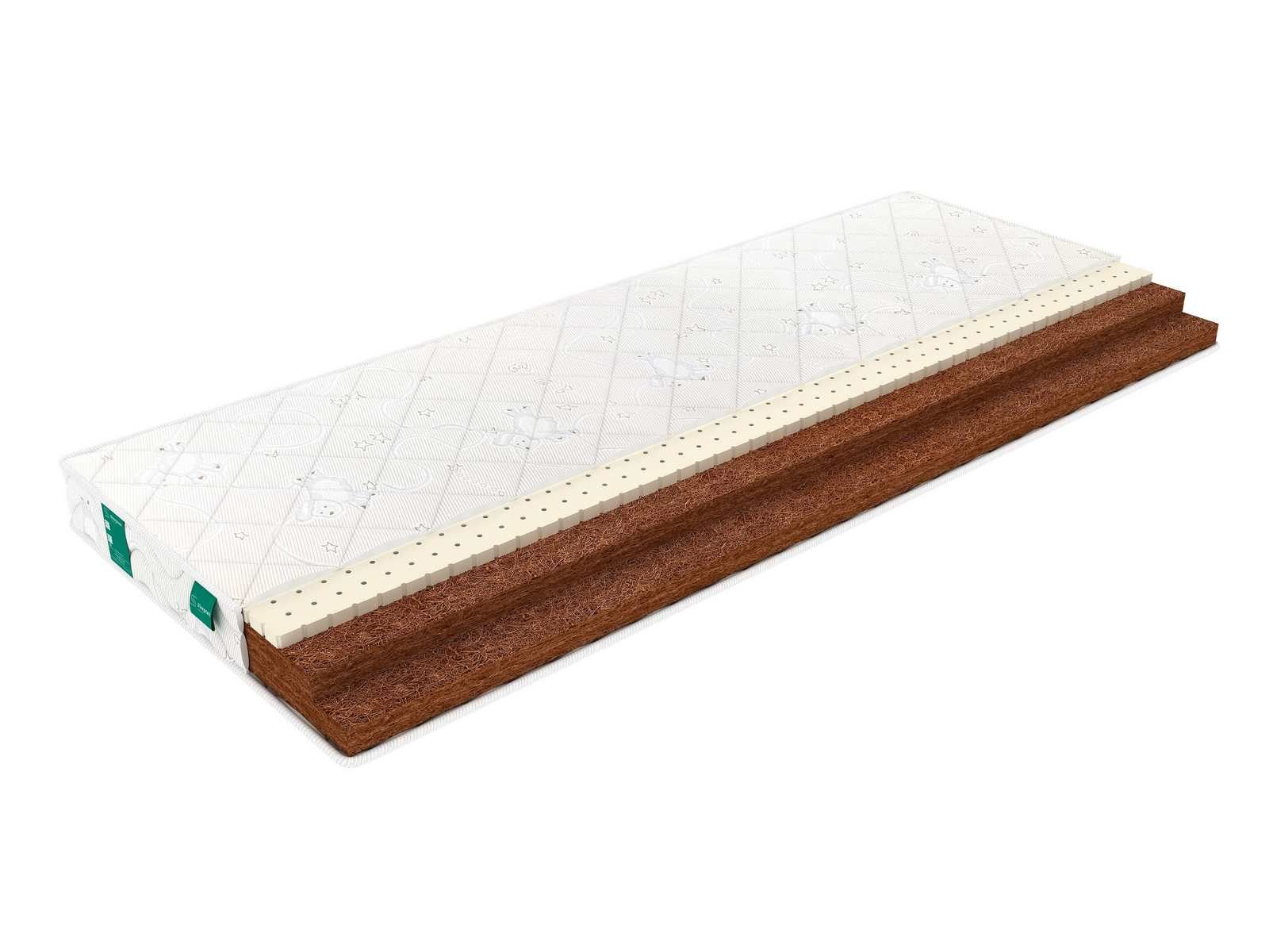 Матрас беспружинный, основан на комбинации плит натуральных наполнителей: койры кокоса и латекса. Койра является природным волокном, обладающим высокой твердостью и выраженными ортопедическими свойствами. Латексная пропитка придает койре долговечность. Жесткая койра полезна для формирования хорошей осанки, при этом она отлично вентилируется, полностью безопасная и гипоаллергенна.
