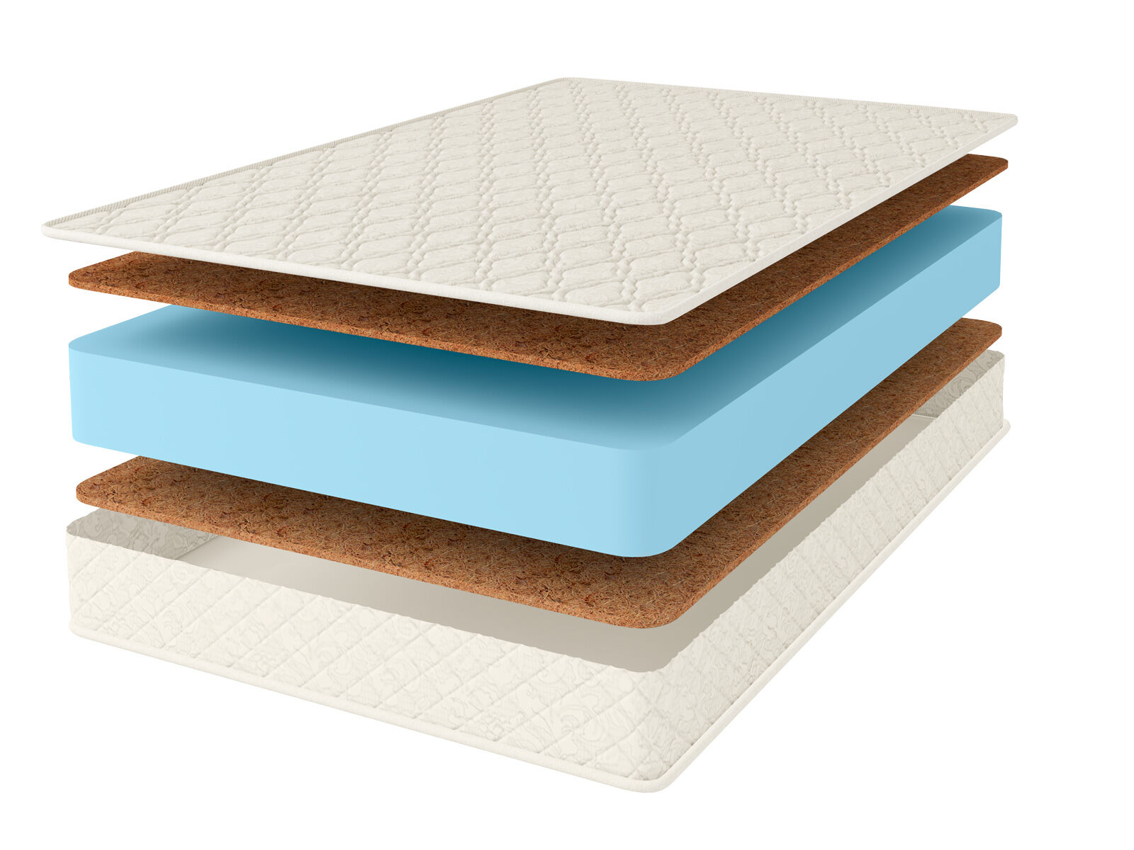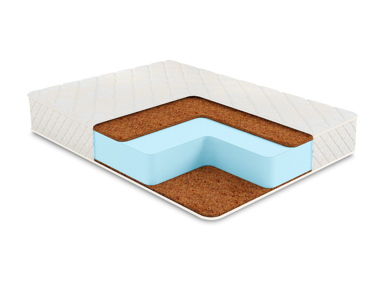 Наполнителями для модели служит пена Ecofoam и кокосовая койра, проложенная с обеих сторон матраса. Если пена здесь выступает амортизирующей сердцевиной, которая несёт основную нагрузку и по сути полноценно заменяет собой пружинный блок, то койра отвечает за совсем другие функции. Она передаёт поверхностям жёсткость и ортопедические качества. Благодаря койре матрас удерживает спину и позвоночник человека в анатомически правильном положении.