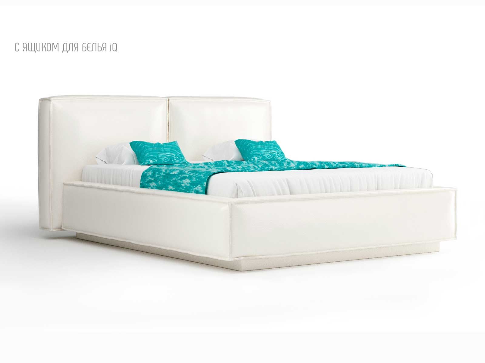 Кровать укомплектована IQ с подъемным механизмом и ящиком для белья без дна (дополнительная платная опция - дно к ящику IQ из HDF (ХДФ). Каркас кровати на цоколе, декоративный чехол на цоколе съёмный. Глубина ящика для белья - 30 см, без ограничения нагрузки на ящик.