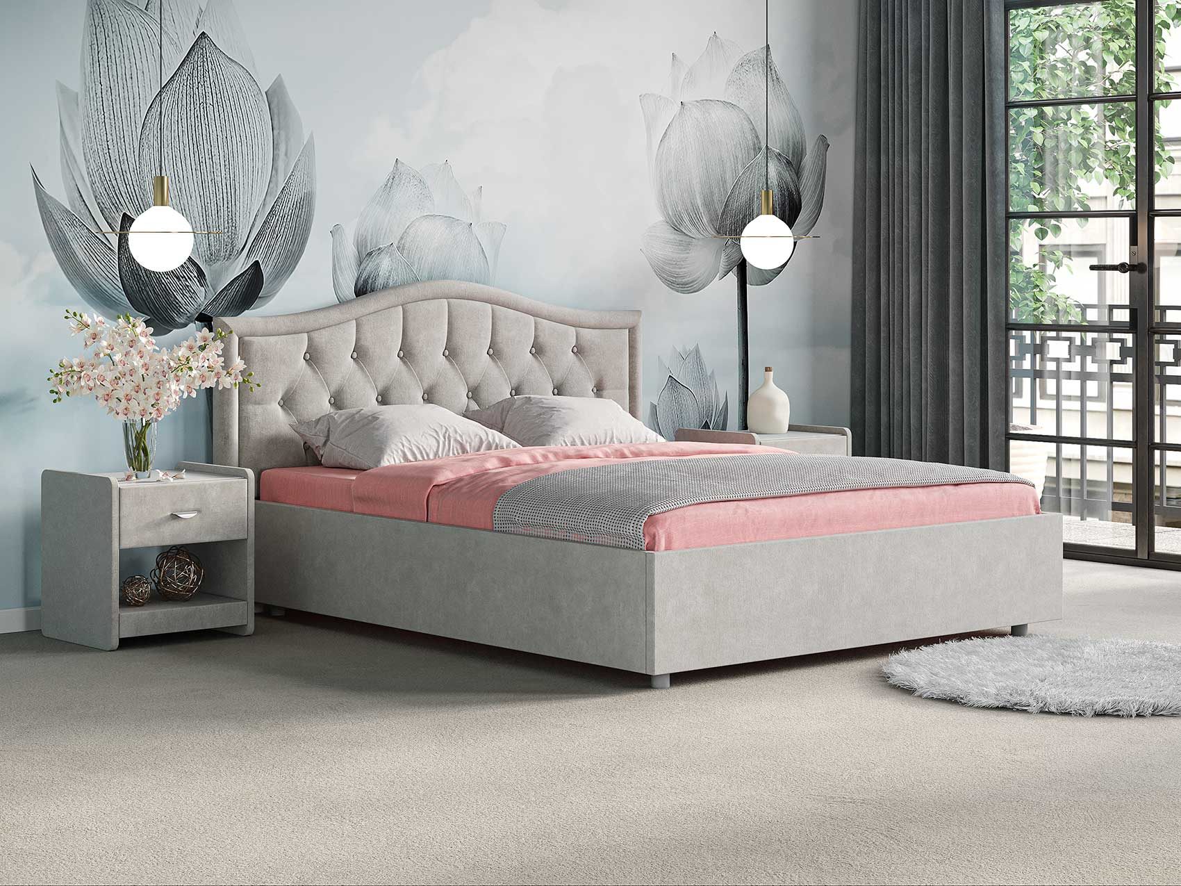 Элегантная интерьерная кровать Ancona, украшенная декоративными пуговицами, которые можно заменить на стразы. Модель изготовлена из ДСП. Обратная сторона изголовья обита спандбондом, но её можно выполнить из основного обивочного материала. При необходимости кровать может быть укомплектована разборным или неразборным металлическим основанием с ламелями, подъемным механизмом с бельевым ящиком, трансформируемым основанием Aquarius (размером 160-200).