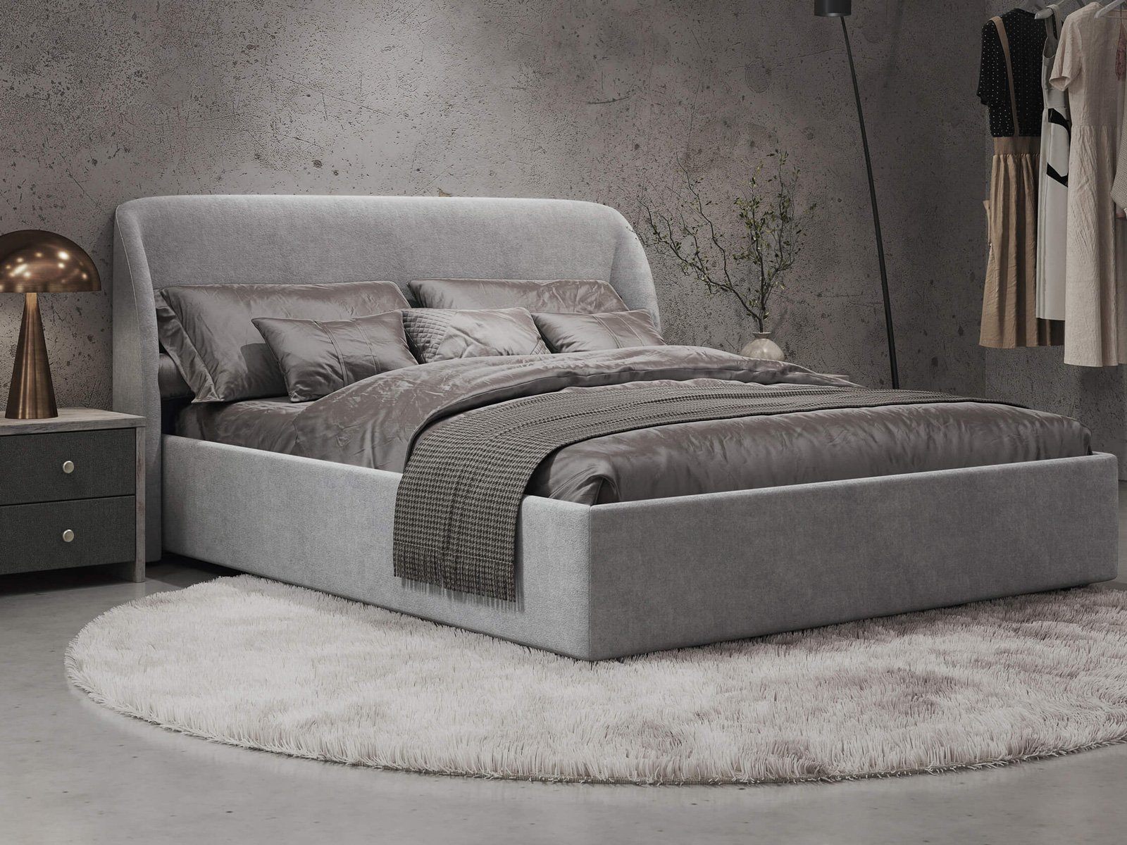 Кровать Nicole удачно подойдет для интерьеров в современном стиле, стиле минимализм и модерн. Дизайнерское закругленное изголовье, широкие царги и минимальный просвет от пола, делают спальное место особенно уютным. Задняя часть изголовья кровати выполнена в основной ткани, благодаря этому ее можно установить в центре комнаты. Кант на изголовье подчеркивает его выразительность.