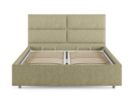 Лаконичная модель с изголовьем из объемных прямоугольников, сшитых между собой. Царги кровати выполняются по технологии съемного чехла. Модель изготовлена из ДСП. Обратная сторона изголовья обита спандбондом, но, при желании, её можно выполнить из основного обивочного материала.