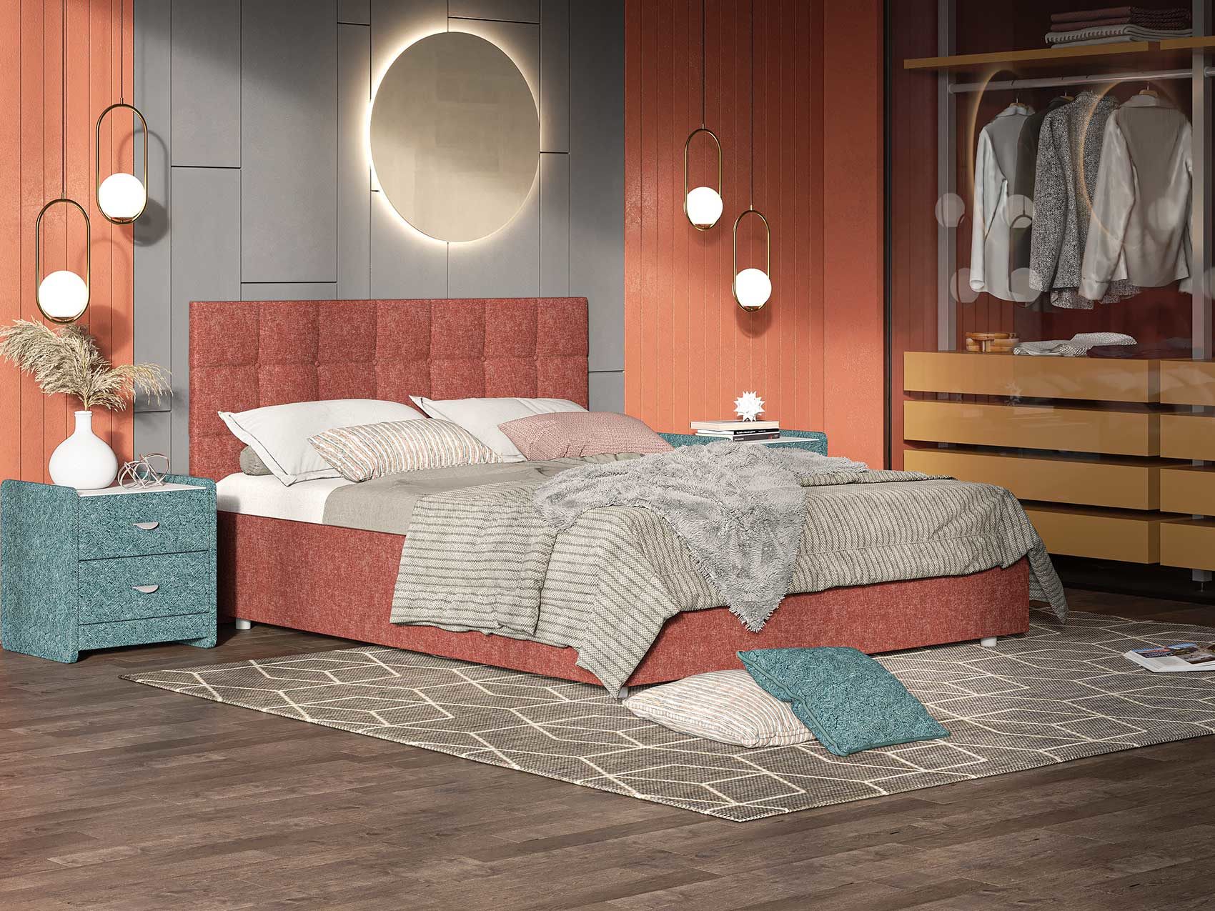 Элегантная интерьерная кровать с изголовьем, украшенным декоративными пуговицами, которые можно заменить на стразы. Модель изготовлена из ДСП.