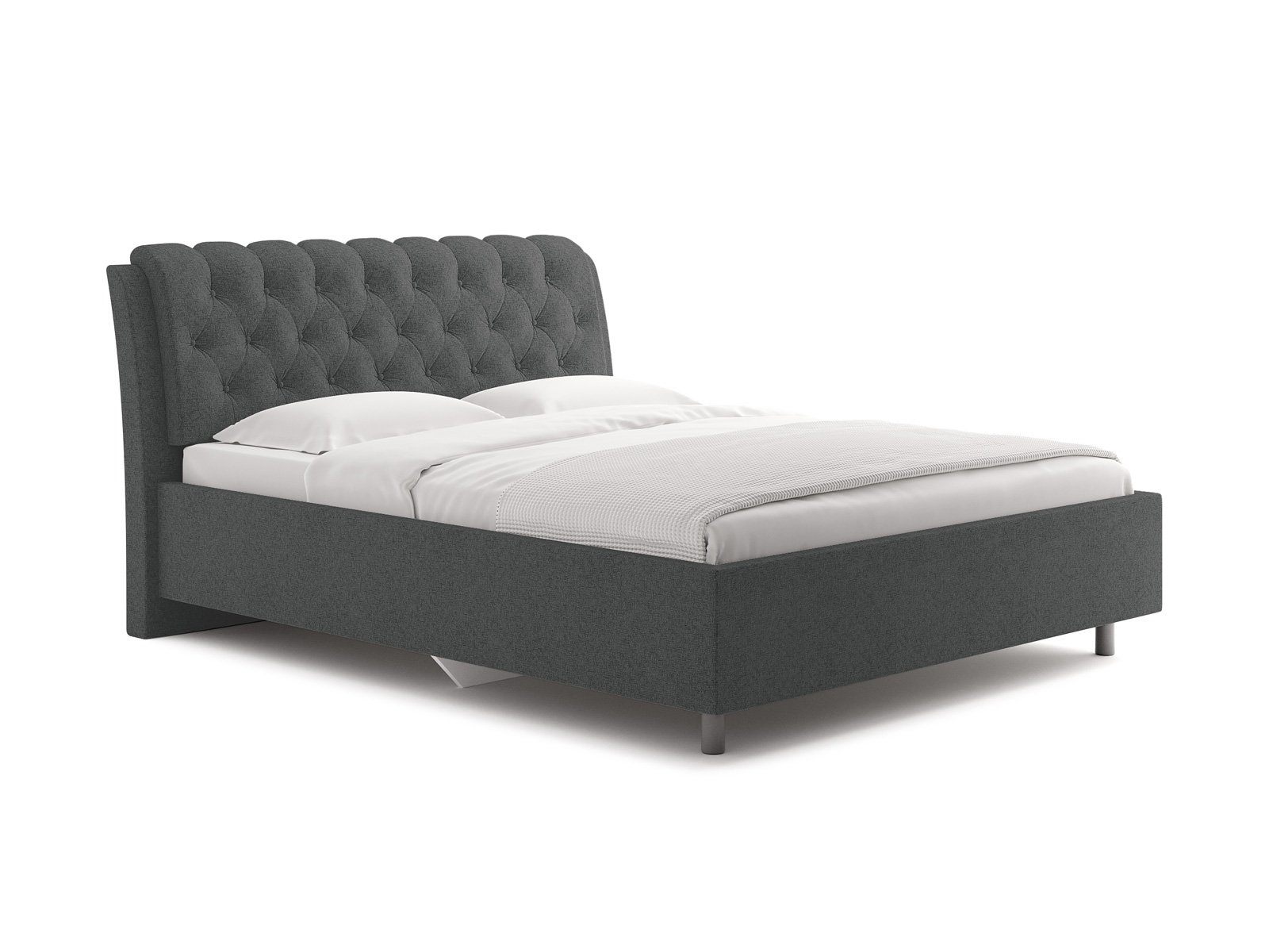 Элегантная интерьерная кровать с изголовьем, украшенным декоративными пуговицами и глубокой пиковкой. Модель изготовлена из ДСП.