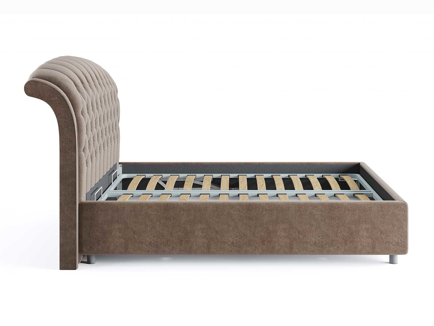 Кровать комплектуется металлическим основанием (без опор), которое имеет 13 рядов встроенных березовых ламелий на каждое спальное место, обеспечивая равномерное распределение нагрузки.