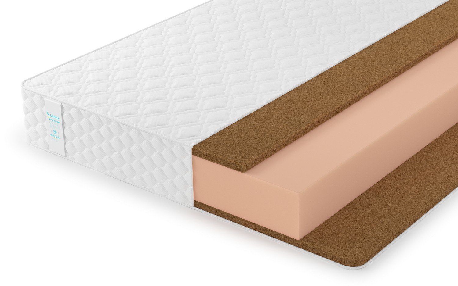 Сверху и снизу от пенополиуретанового блока прокладываются слои койры кокоса толщиной 3 см. В разрезе такая структура напоминает своеобразный сэндвич. Большой объём кокоса даёт высокую жёсткость, поскольку это твёрдая и очень плотная плита. У койры есть важное качество: несмотря на свою жёсткость, она умеет повторять изгибы силуэта и даёт ортопедически правильную поддержку для спины. Не случайно данный наполнитель очень любят врачи-ортопеды и предпочитают люди, заботящиеся о своей осанке. К тому же, кокос отлично «дышит», благодаря своему природному происхождению, поэтому ничто не препятствует естественной вентиляции внутри матраса.