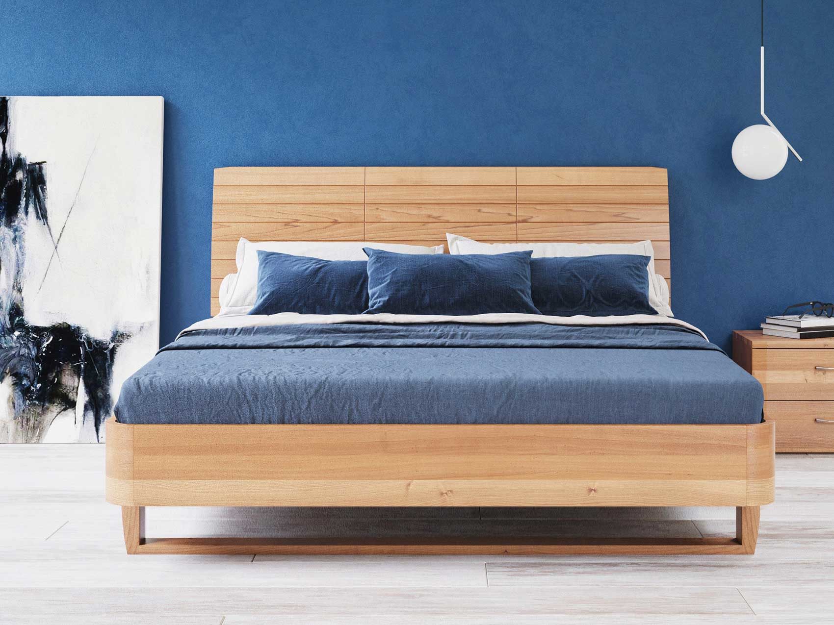 Корпус кровати Сен Реми изготовлен из массива бука. Изголовье высотой 104 см представляет собой деревянные пластины, установлены под углом. За счет этого получается слегка выгнутая поверхность удобная для спины, если расположиться сидя на постели. Укомплектована основанием из массива бука. Габаритные размеры: 6,8 см к ширине и 16 см к длине спального места. Не комплектуется ящиком для белья с подъемным механизмом.